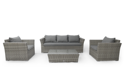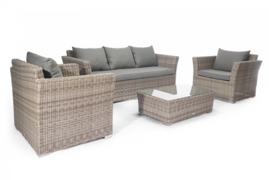 מורכבת ספה תלת מושבית ושתי כורסאות יחיד בתוספת ,BEIRRA מערכת ישיבה ראטן דגם .שולחן תואם המערכת המפוארת בנויה משילדת אלומיניום בחיפוי ראטן סינטטי מעוצב ואלגנטי, וכוללת ריפודים רחיצים בגוון אפור הדור :מידות ספת תלת : 85*67*220 ס"מ מושב יחיד : 85*77*105 ס"מ שולחן : 66*30*110 ס"מ