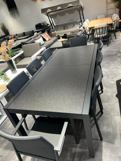 שולחן דגם PULA בסיס שילדת האלומיניום צבוע בשחור , המשטח העליון של השולחן הוא שיש בגוון שחור. כולל 8 כיסאות בגוון אפור כהה, המקנה לכל המערכת מראה אלגנטי.מידות:200*105 פתיחה: 340 השולחן והכיסאות מעוצבים ומייצרים מראה אלגנטי  ומיוחד בגינה או במרפסת